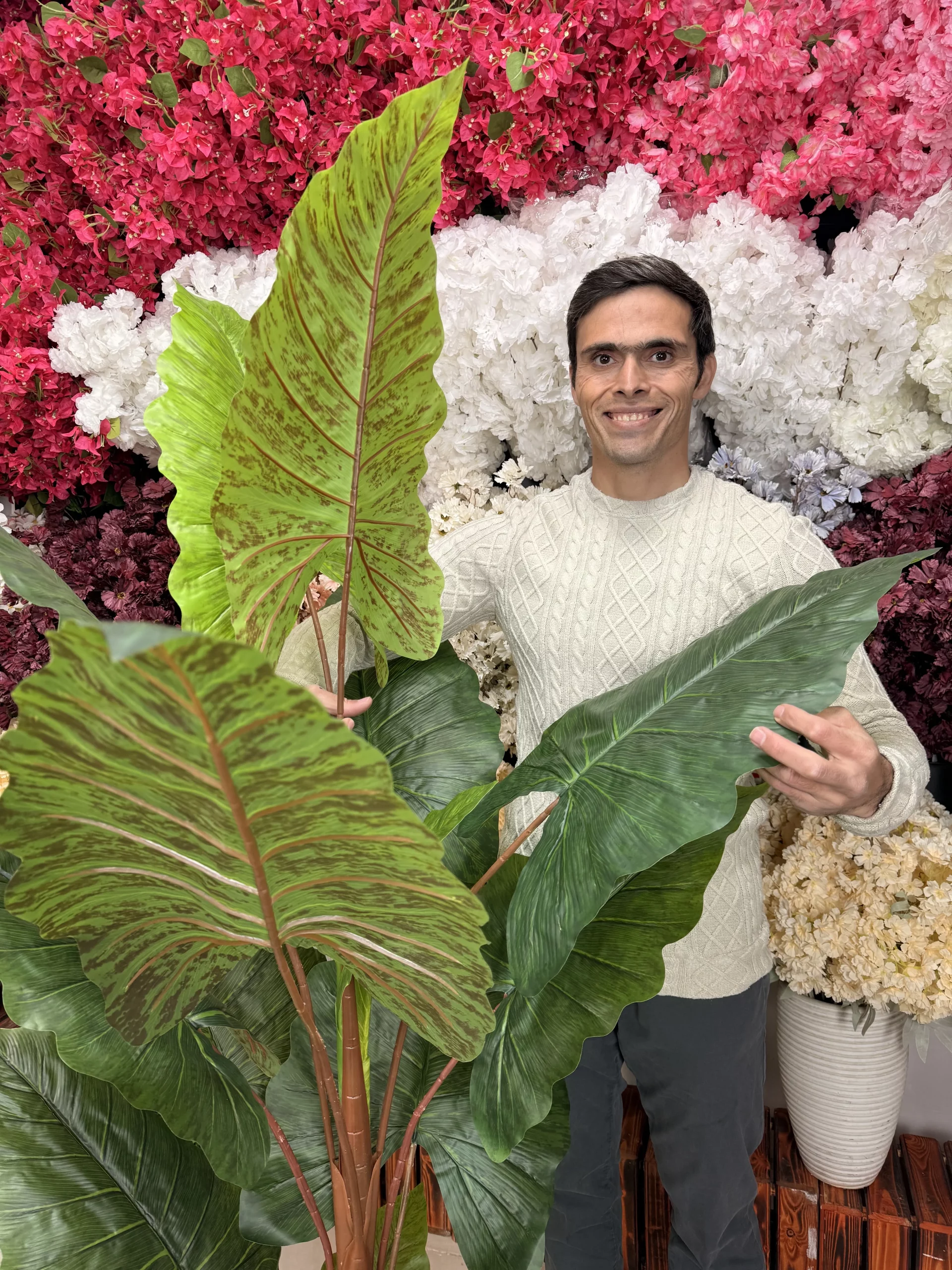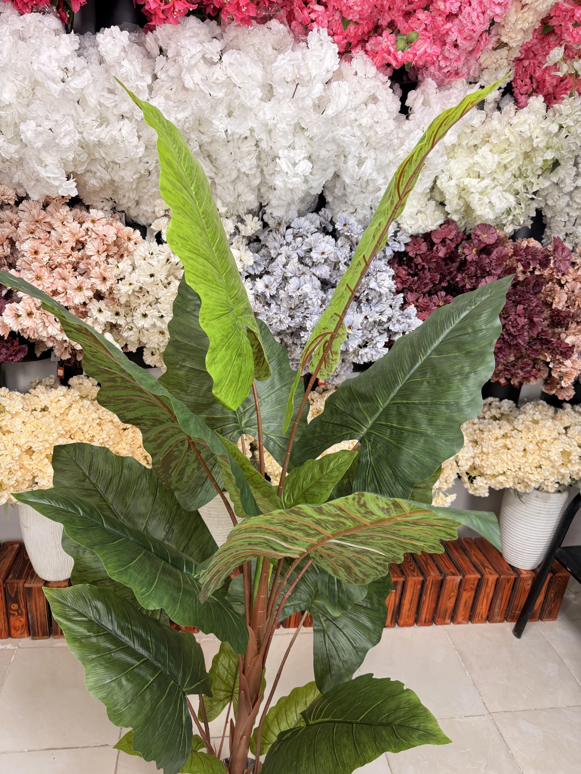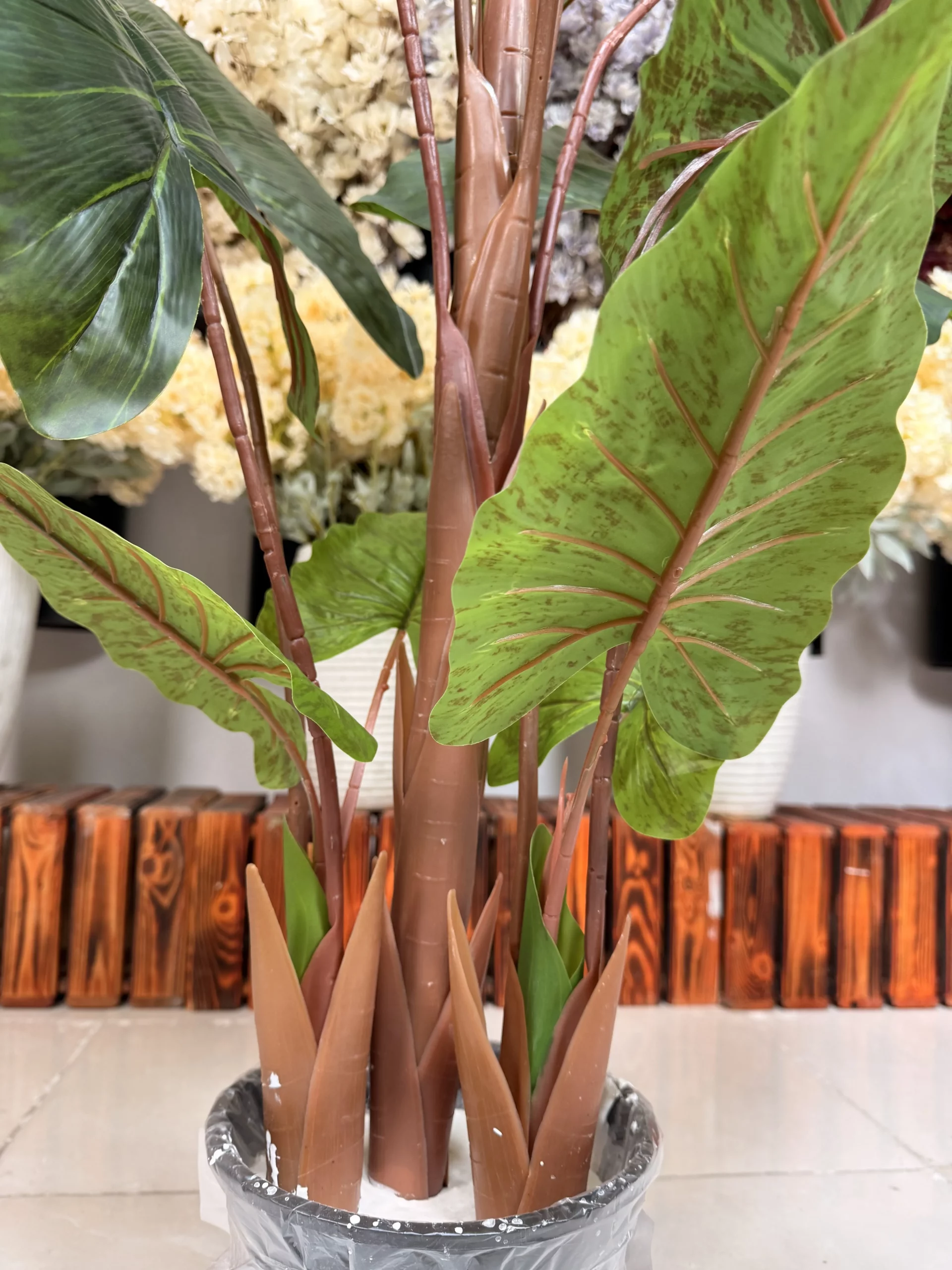 | جنس و کیفیت برگها | برگها از مواد درجه یک ساخته شدهاند و ظاهر و حس برگ طبیعی Alocasia را تداعی میکنند. پشت برگها دارای طرح چریکی (رگههای برجسته و طبیعی) است. |