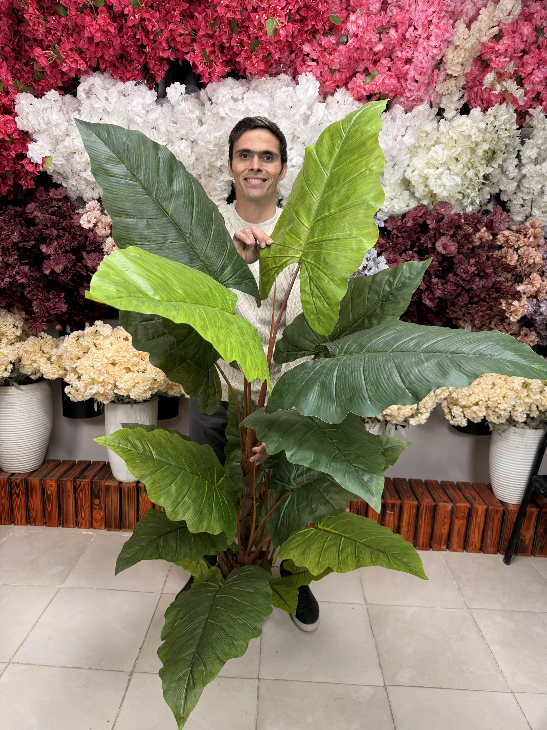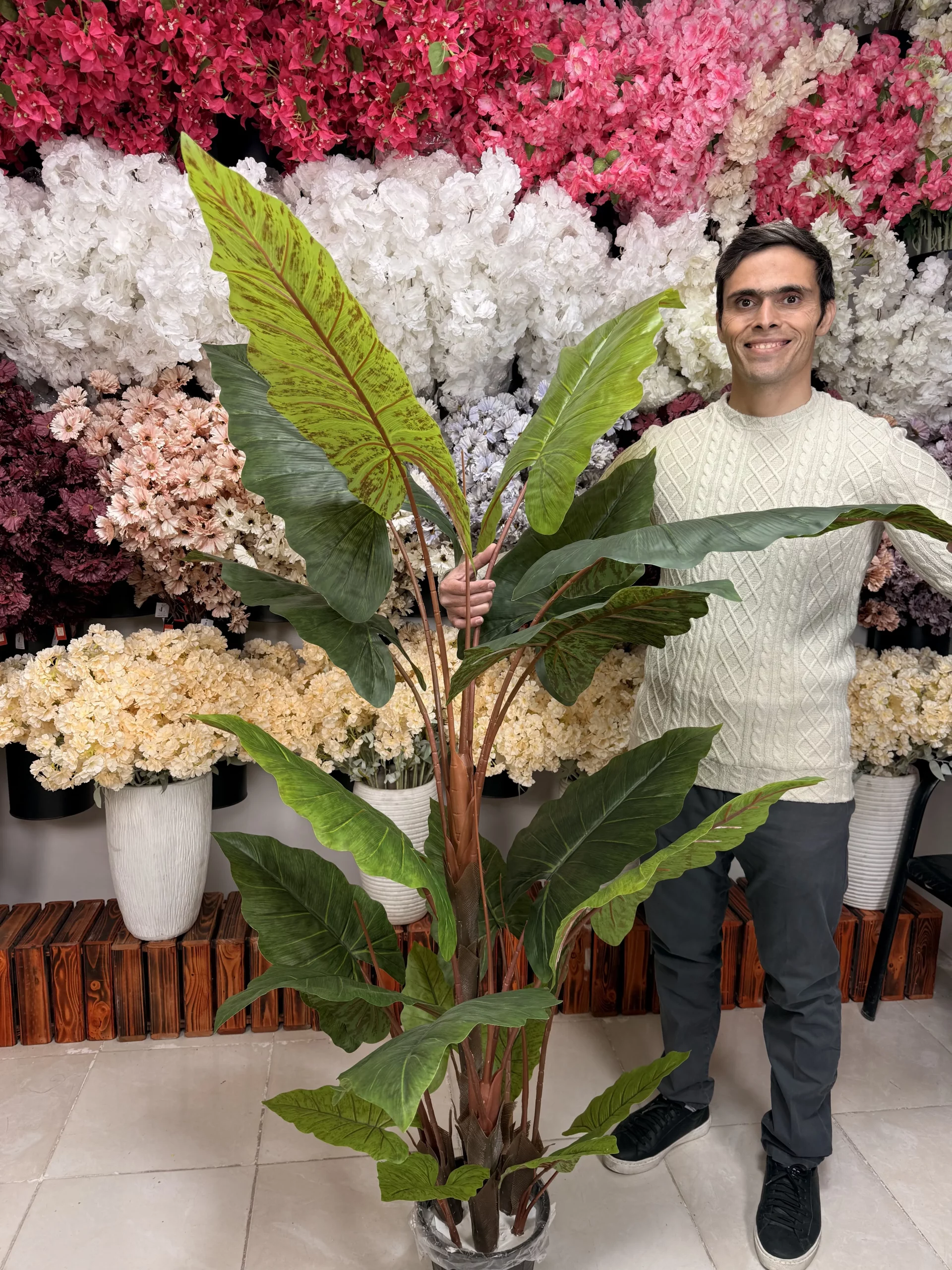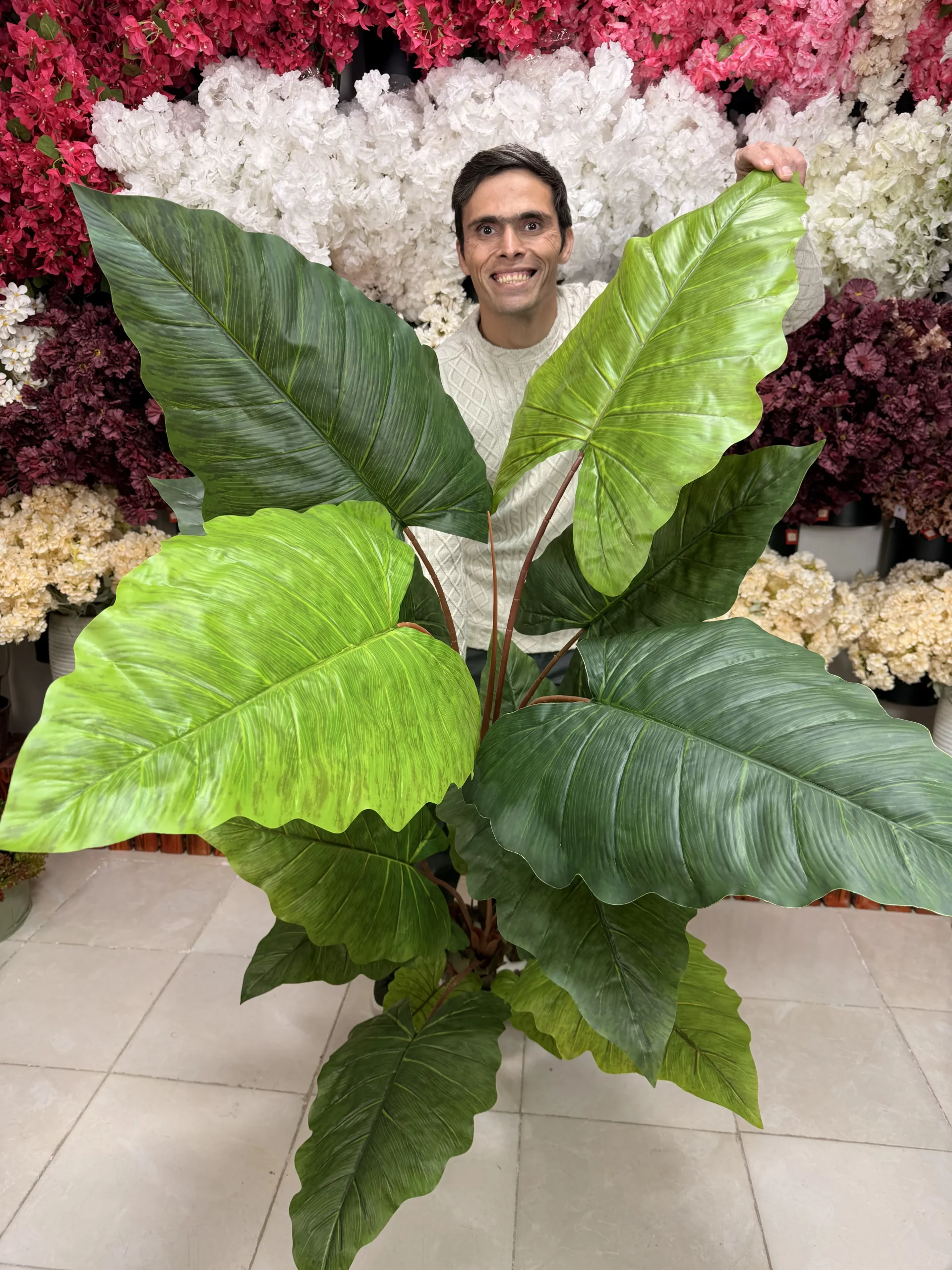لمس کن تا باورت بشه! جنس برگهای این درختچه از نوع “لمسی” درجه یک است؛ یعنی وقتی دست خود را روی برگهای پهن و زیبای آن میکشید، حس خنکی و بافت یک برگ واقعی را تجربه خواهید کرد. برگهای بزرگ با ابعاد ۶۰ در ۳۶ سانتیمتر و برگهای کوچکتر در کنار ۳ پاجوش طبیعی، تراکمی بینظیر به قطر حدود یک متر ایجاد کردهاند که فضا را پر از زندگی و طراوت میکند.